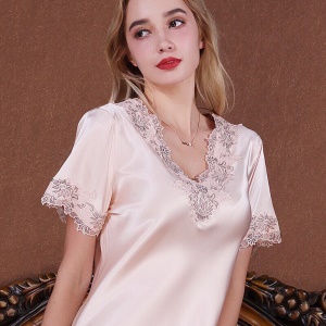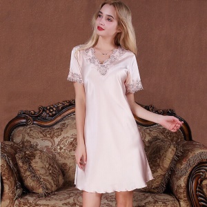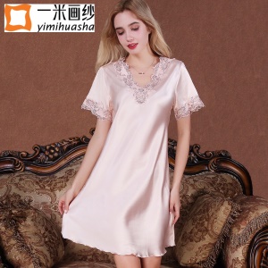 一米画纱仿 真丝睡衣女夏天冰丝睡裙 女士短袖性感连体丝绸桑蚕丝家居服 香槟 均码