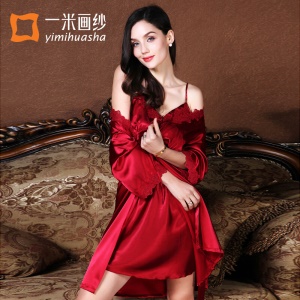 一米画纱仿 真丝睡衣女春秋吊带睡裙夏天冰丝睡袍女士性感桑蚕丝丝绸套装 酒红 L