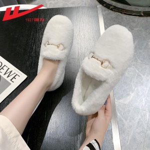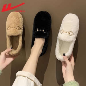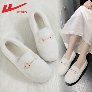 回力女鞋 豆豆鞋女鞋加绒棉保暖2021新品秋冬季女士羊羔毛平底百搭懒人一脚蹬单鞋毛毛鞋子女棉拖鞋 0110白色 请选择正确尺码