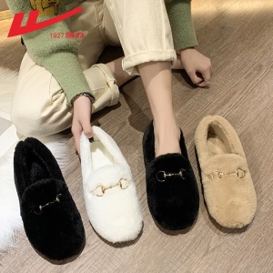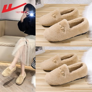 回力 豆豆鞋女鞋加绒棉保暖鞋2021新品秋冬季女士羊羔毛平底百搭懒人一脚蹬单鞋毛毛鞋子女 棕色(马衔扣款) 0110 38