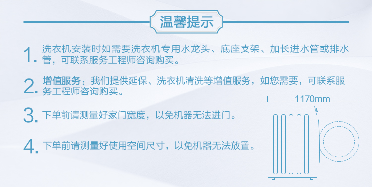 包装清单:洗衣机×1说明书(含保修卡)×1进水管×1