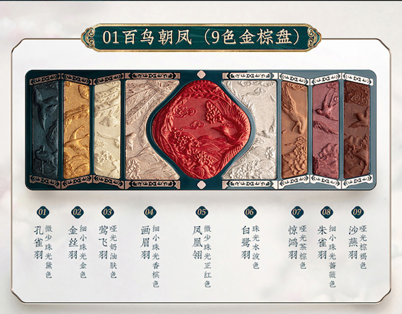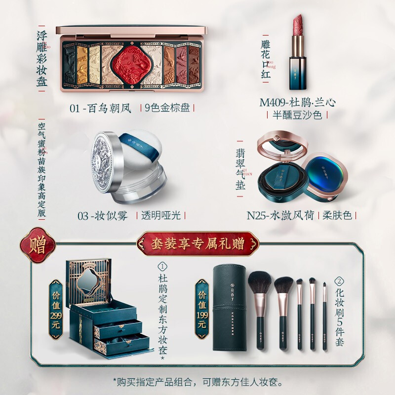 1.玉容睡莲养肤气垫粉底液N25水潋风荷*12.玉女桃花轻蜜粉(苗族印象经典版)03妆似雾*13.雕花口红M409杜鹃·兰心*14.彩妆盘01百鸟朝凤(9色金棕盘)*1