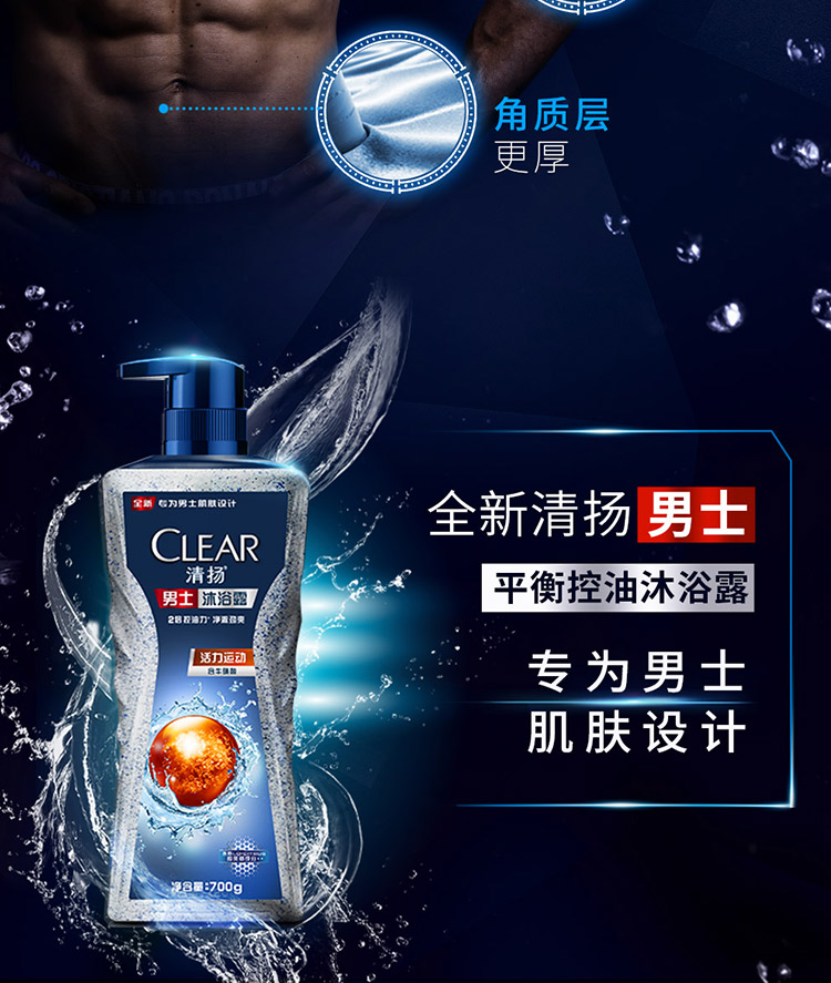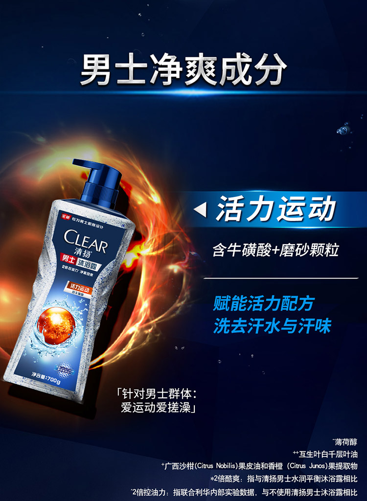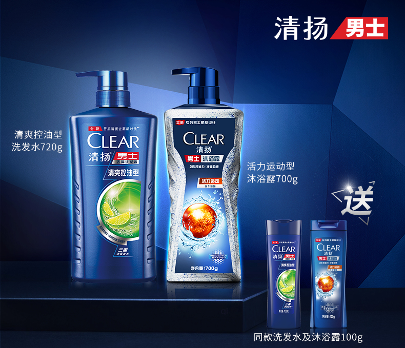 包装清单:清扬(CLEAR)洗发水沐浴露套装活力运动沐浴露700gx1清爽控油型洗发露720gx1活力运动沐浴露100gx1清爽控油洗发露100gx1