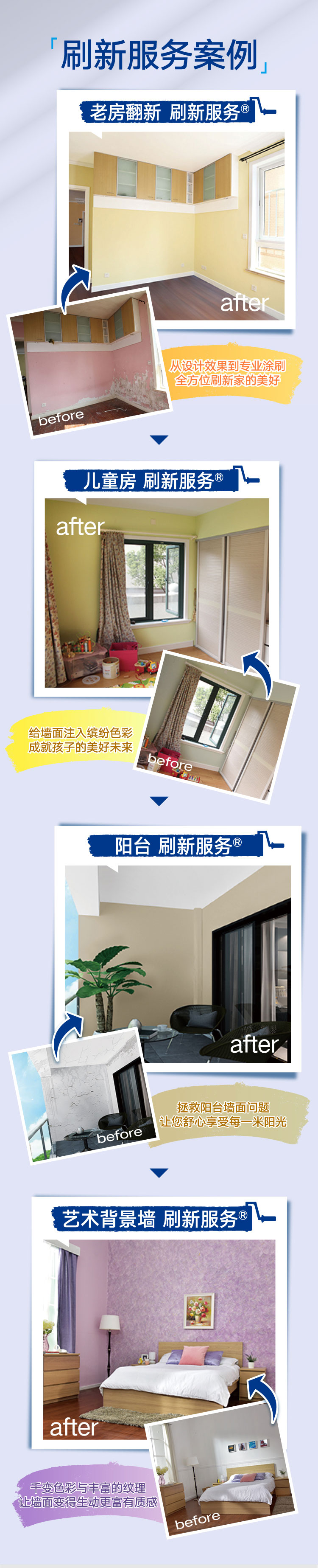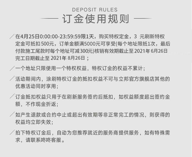 商品名称:立邦刷新服务 旧房翻新/新房装修改造 乳胶漆油漆涂料尾款核销粉刷旧房老房刷墙服务 特权定金
