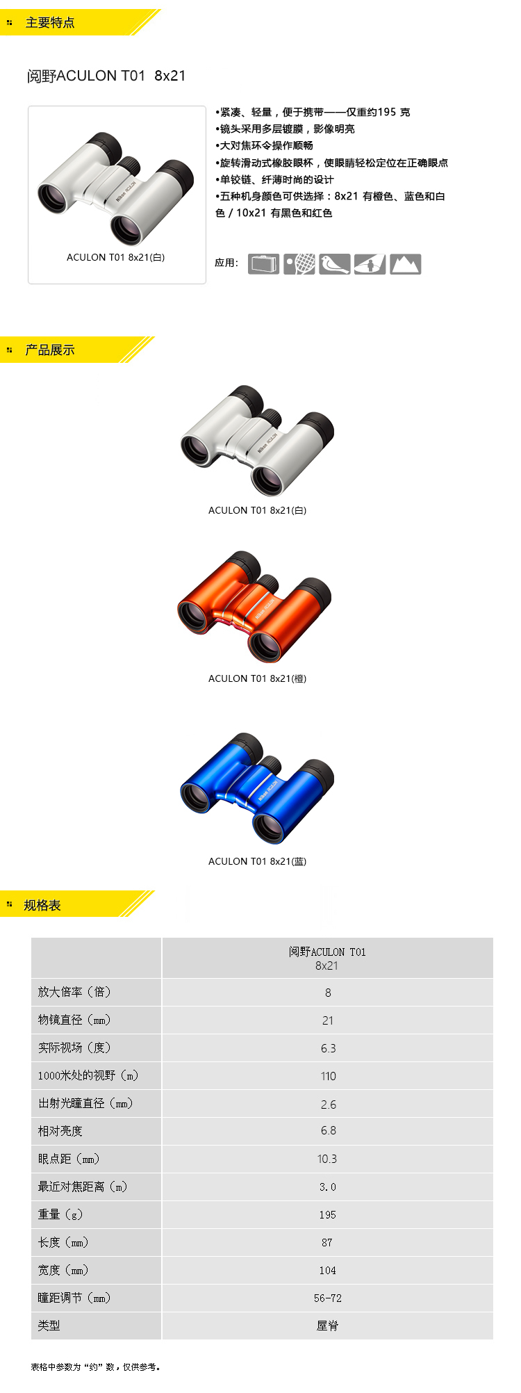 商品名称:Nikon/尼康 双筒望远镜ACULON T01 8X21 户外轻便望远镜 观赛远摄好伴侣 蓝色 标配