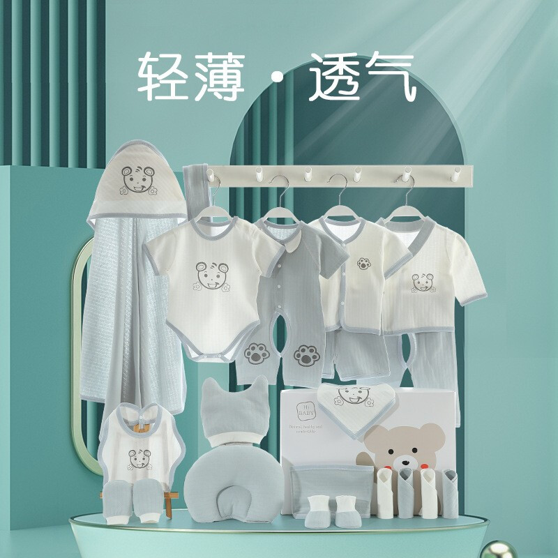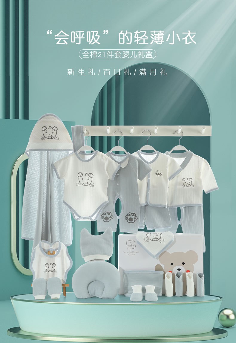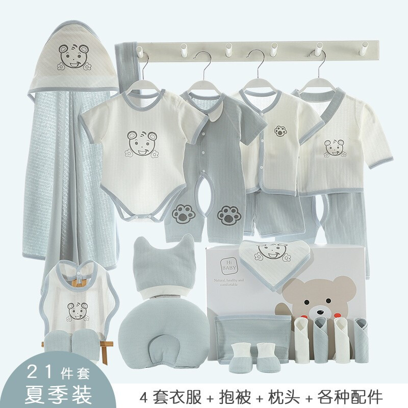 巴克龙纯棉婴儿礼盒套装新生儿礼物满月送礼宝宝服装薄款刚出生用品高档春夏季百日宝宝用品大全连体服爬行服 21件夏季蓝 66cm(4-6个月)
