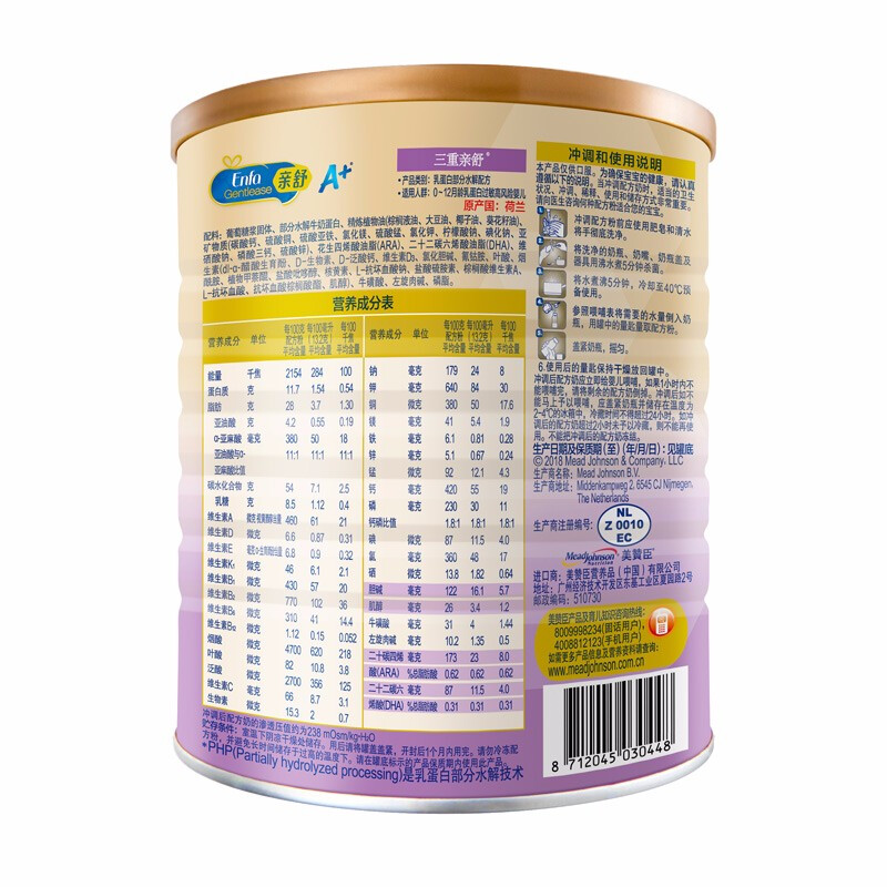 特殊配方:适度水解奶粉