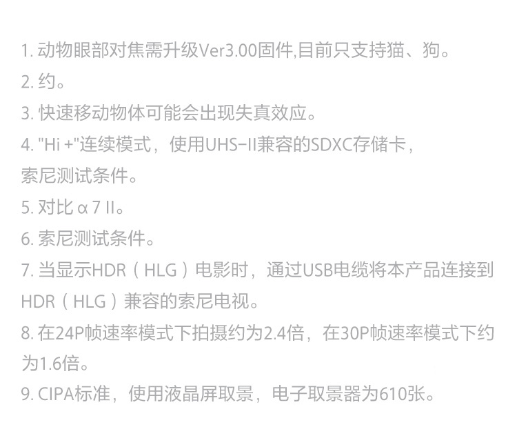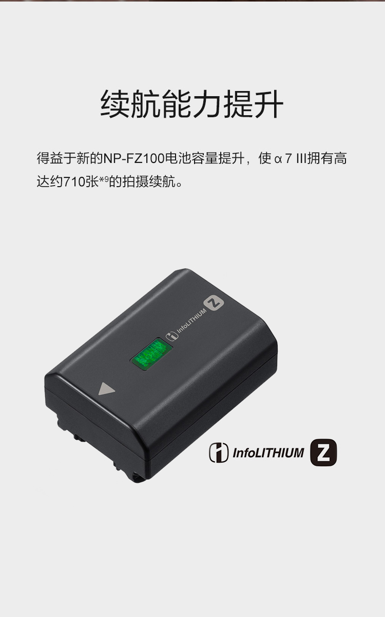 包装清单:Alpha 7 III (1)可重复充电电池 (1)电源适配器 (1)肩带 (1)Micro USB连接线 (1)机身盖 (1)眼罩 (1)产品说明书 (1)保修卡 (1)参考指南 (1)外包装 (1)