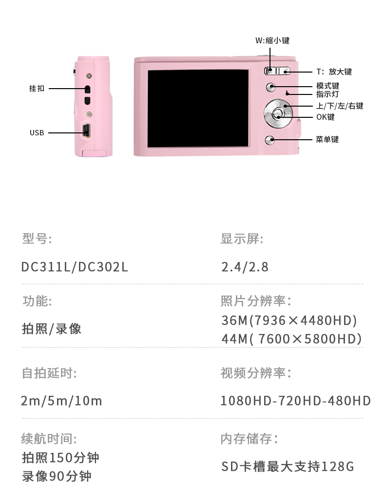 功能:自拍;延时拍摄