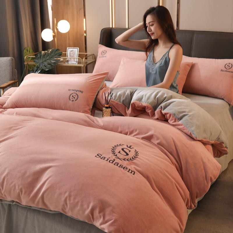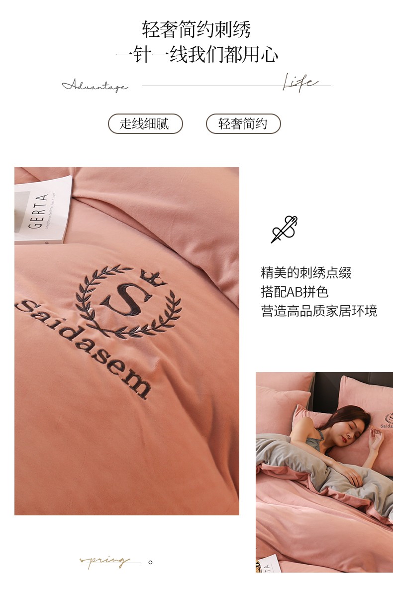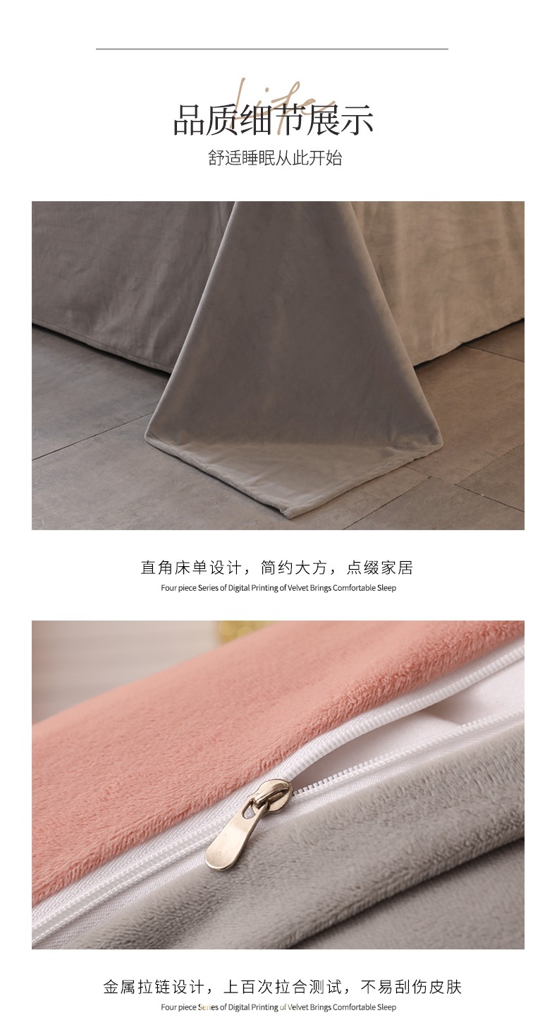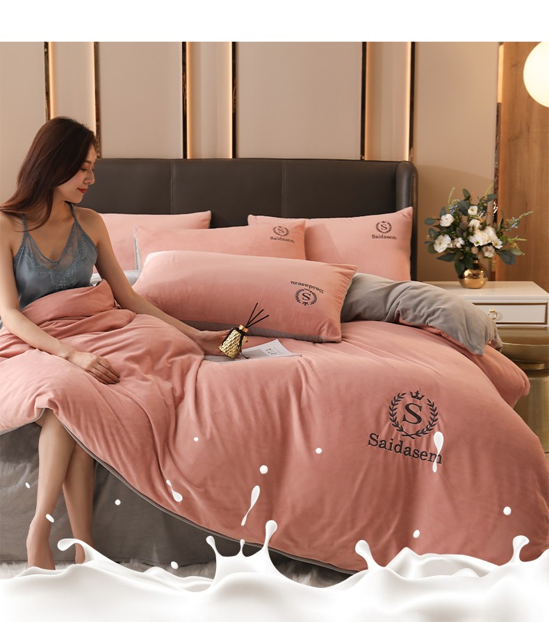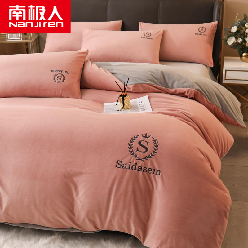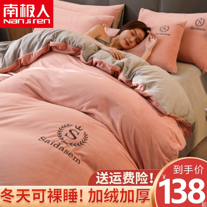 南极人牛奶绒四件套冬季珊瑚绒加厚双面法兰绒床单加绒被套床笠毛绒床上用品套件 水晶绒皇冠-浅豆沙RY 1.8米床【床单款四件套】适合200x230被芯
