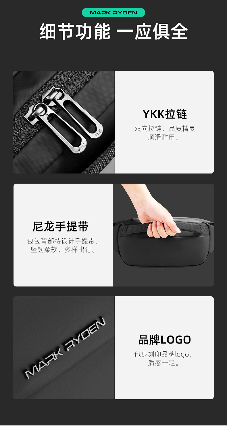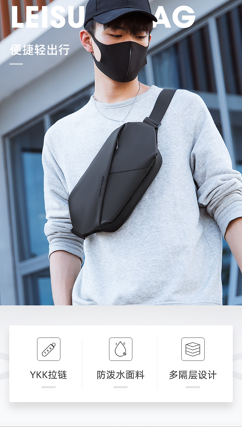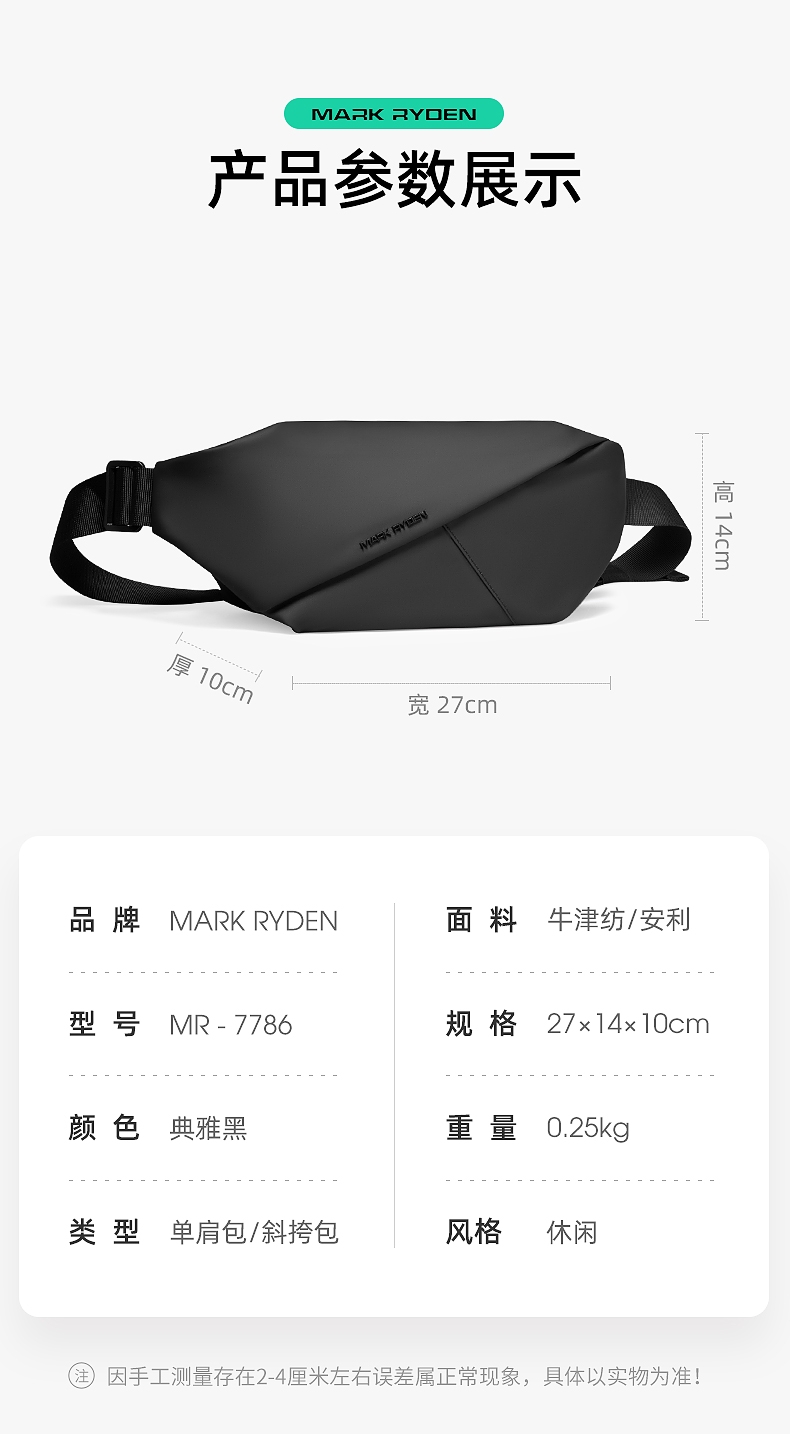 商品名称:马可莱登(MARK RYDEN)单肩包男士包包机车斜挎包时尚潮流胸包骑行腰包迷你大容量手机包MR7786典雅黑