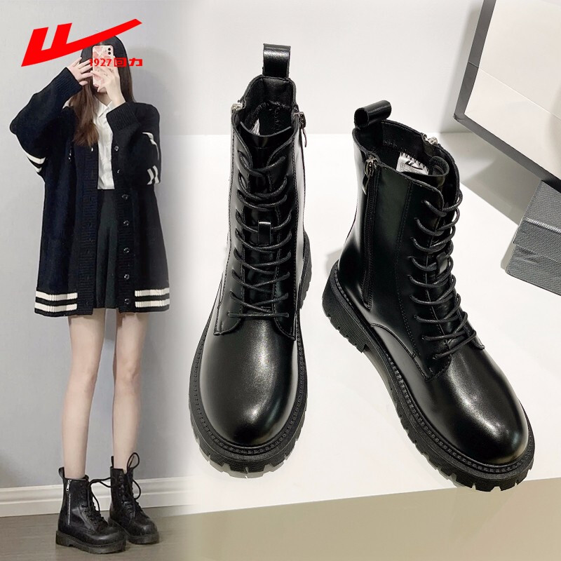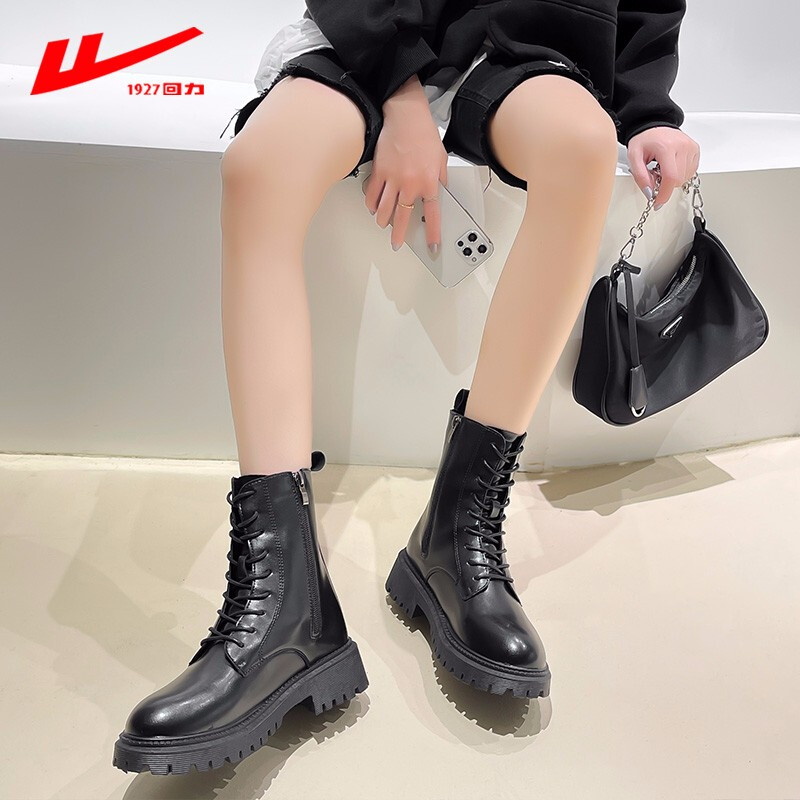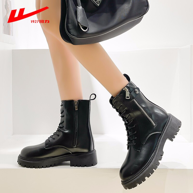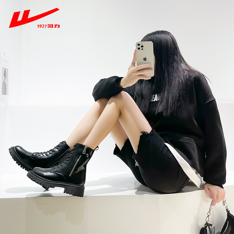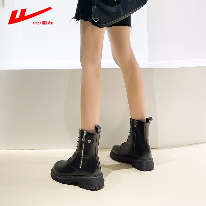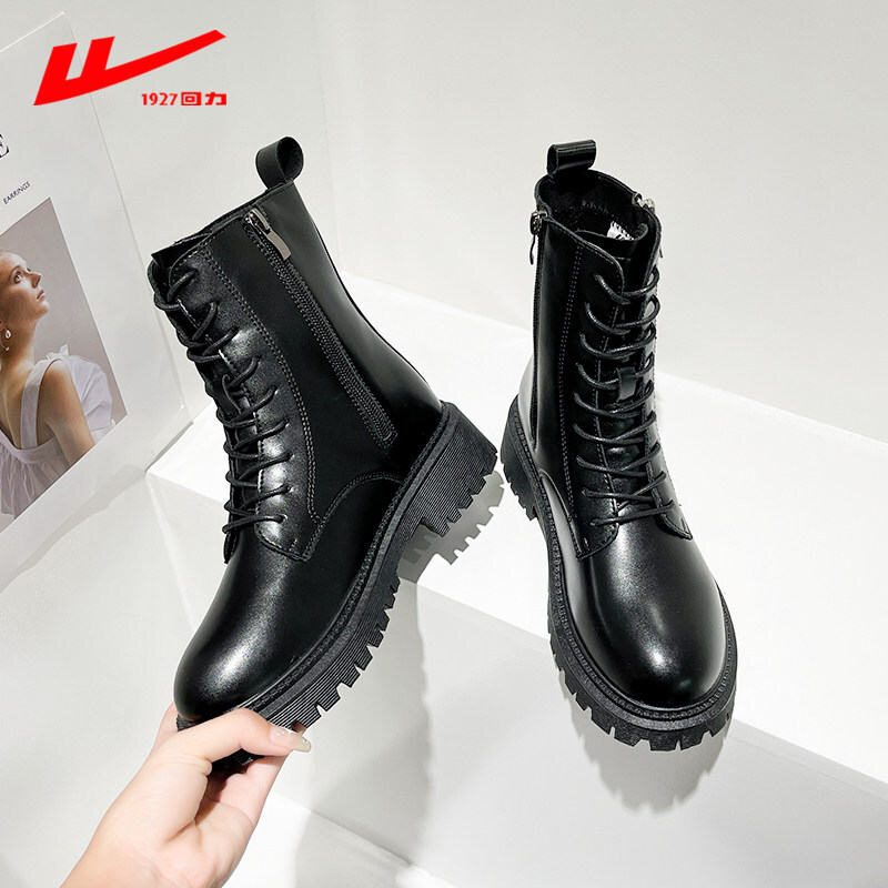 商品名称:回力马丁靴女2021秋冬季新款女鞋单靴厚底小个子棉靴加绒加棉保暖女靴系带软皮短靴女 黑色B 37