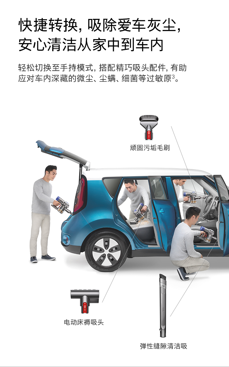 吸头类型:软绒滚筒吸头,电动床褥吸头,顽固污垢毛刷,弹性缝隙清洁吸头