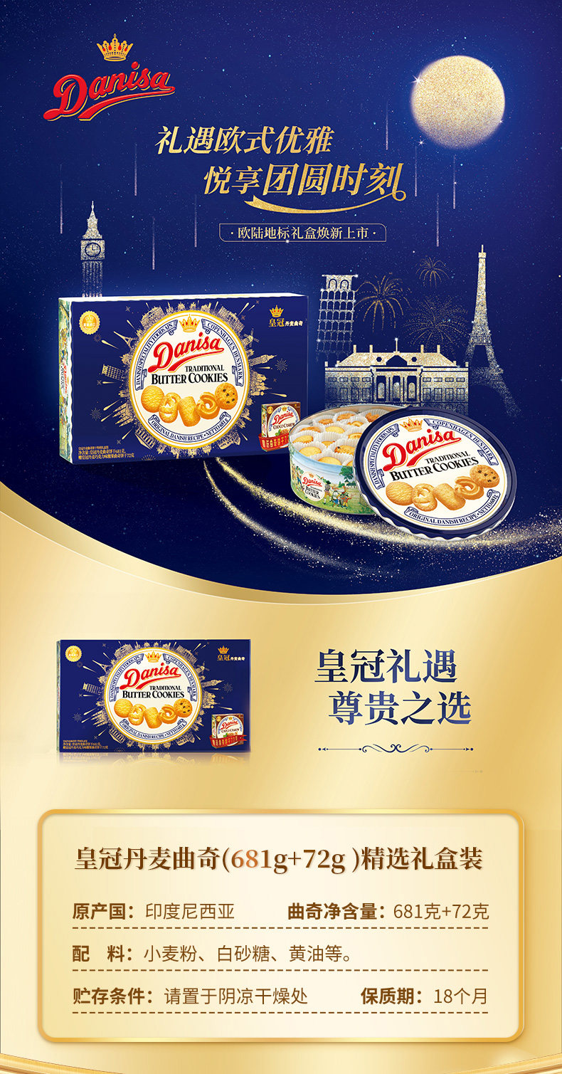 商品名称:皇冠(danisa)丹麦曲奇饼干礼盒908g+60g休闲零食团购中秋团圆送礼物原装进口