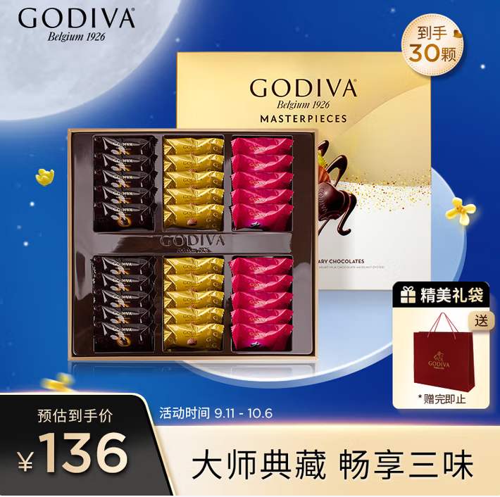 商品名称:歌帝梵(Godiva)经典大师夹心黑巧克力高端礼盒 30颗230g 中秋节礼物 零食 伴手礼
