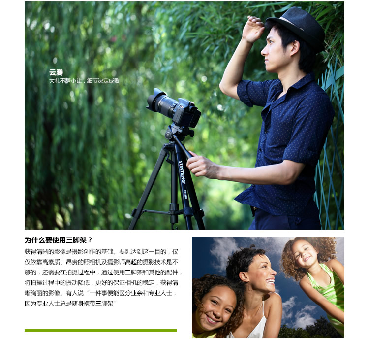 云腾成立于2006年,深受摄影爱好者的喜爱。云腾三脚架拥有多项国家专利,脚架做工精致、工艺卓越、外形美观、轻巧耐用、扎实便携。云腾一直致力于在三脚架及其附属产品上的新材料、新技术的融合运用,创新使云腾成为一个毫不墨守成规的三脚架生产厂家。现在,云腾生产的三脚架、独脚架、自拍杆、云台、快装板等系列产品,是国内具有代表性的摄影器材产品之一。“大礼不辞小让,细节决定成败”,这些看似细微的地方也许正可以反映出造就了一个品牌屹立至今的成功之道。