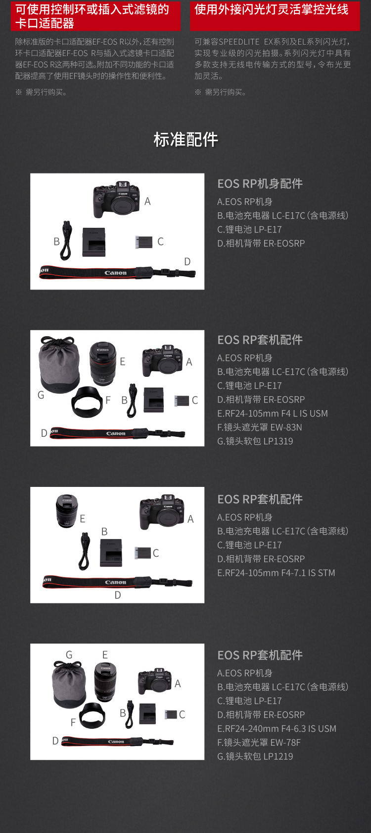 相机宽背带×1,保修卡×1,锂电池LP-E17×1,包装盒×1,电池充电器LC-E17C(含电源线)×1,镜头RF24-105mmF4-7.1ISSTM×1,EOSRP机身×1