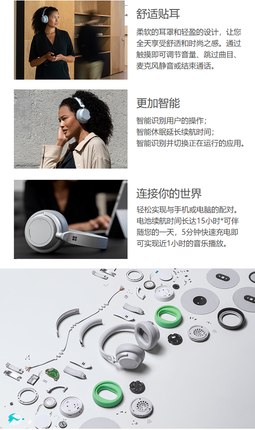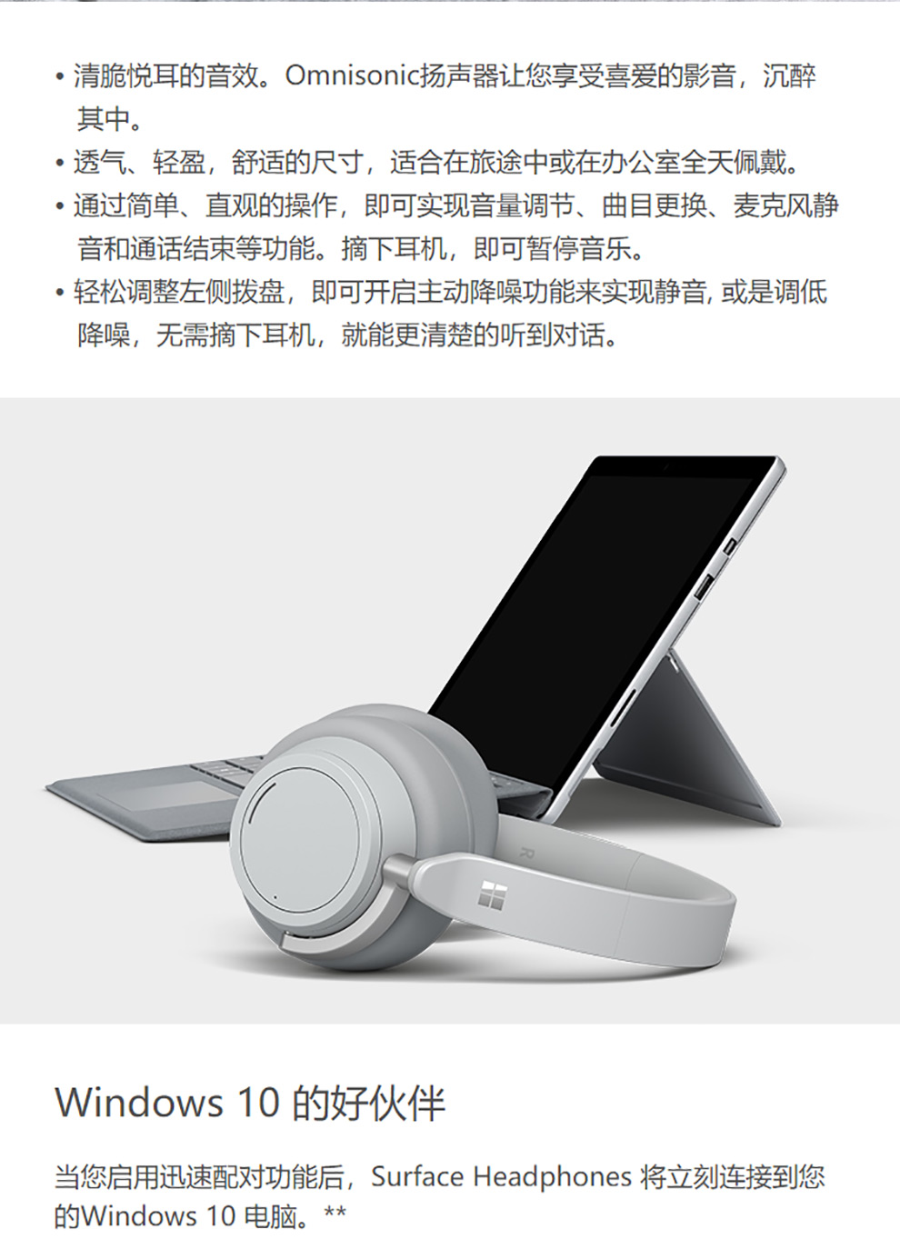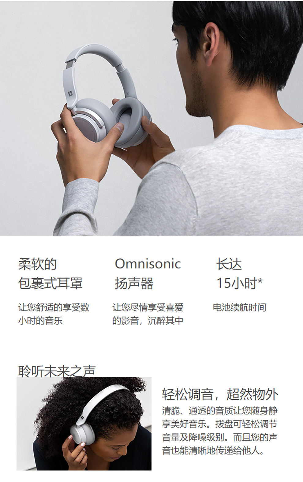 包装清单:SurfaceHeadphones×1,便携盒×1,USB连接线×1,音频线×1,快速入门指南×1,安全及保修文件×1