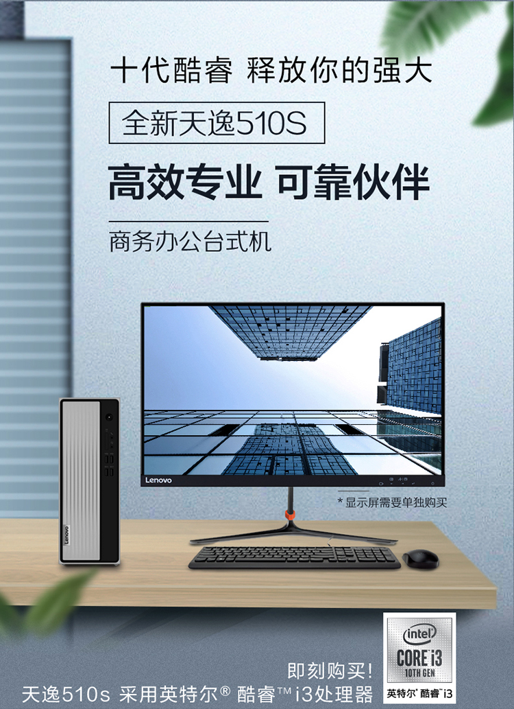 联想(Lenovo)天逸510S 十代英特尔酷睿i3 台式机电脑整机(i3-10100 8G 1T wifi win10 三年上门)21.5英寸